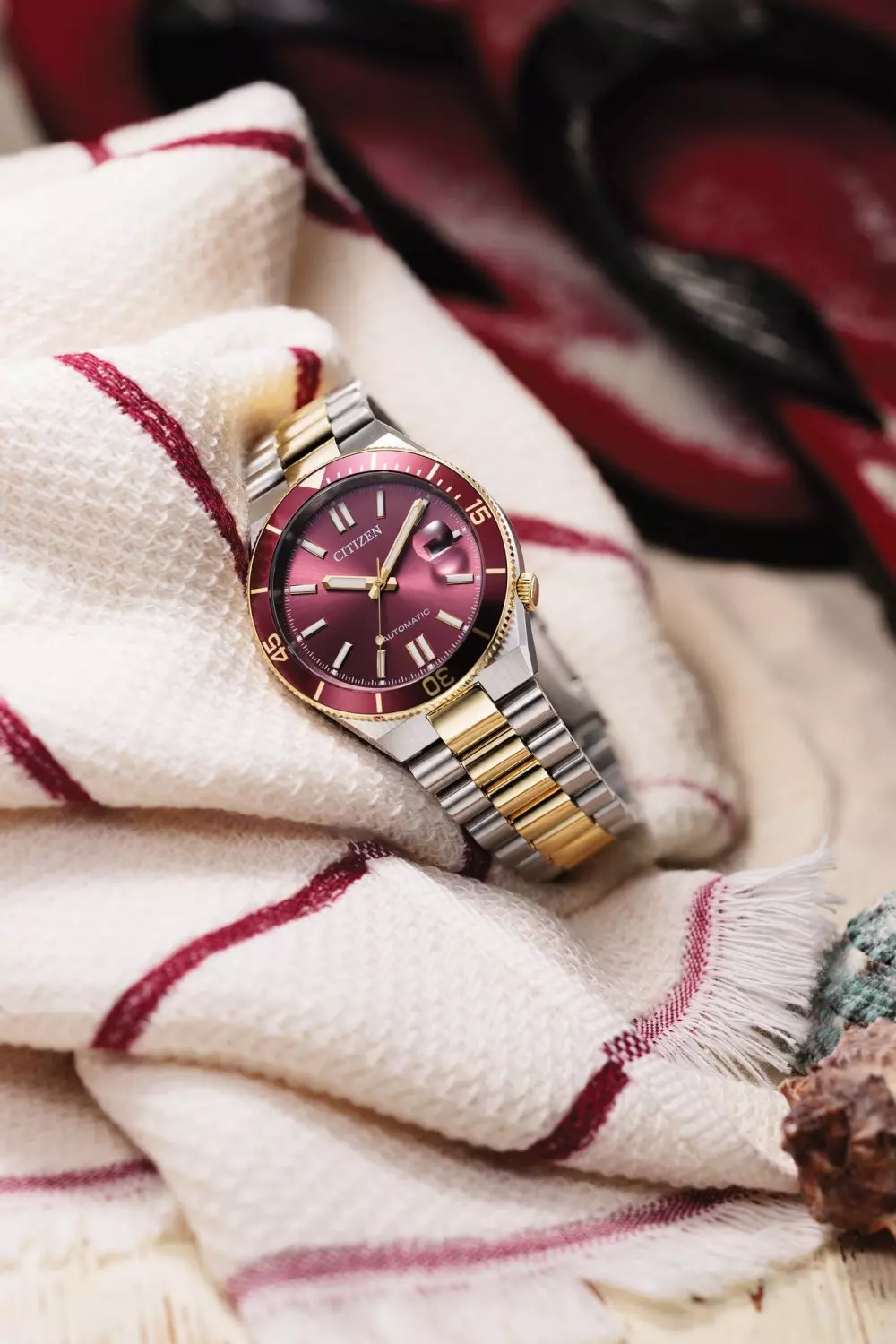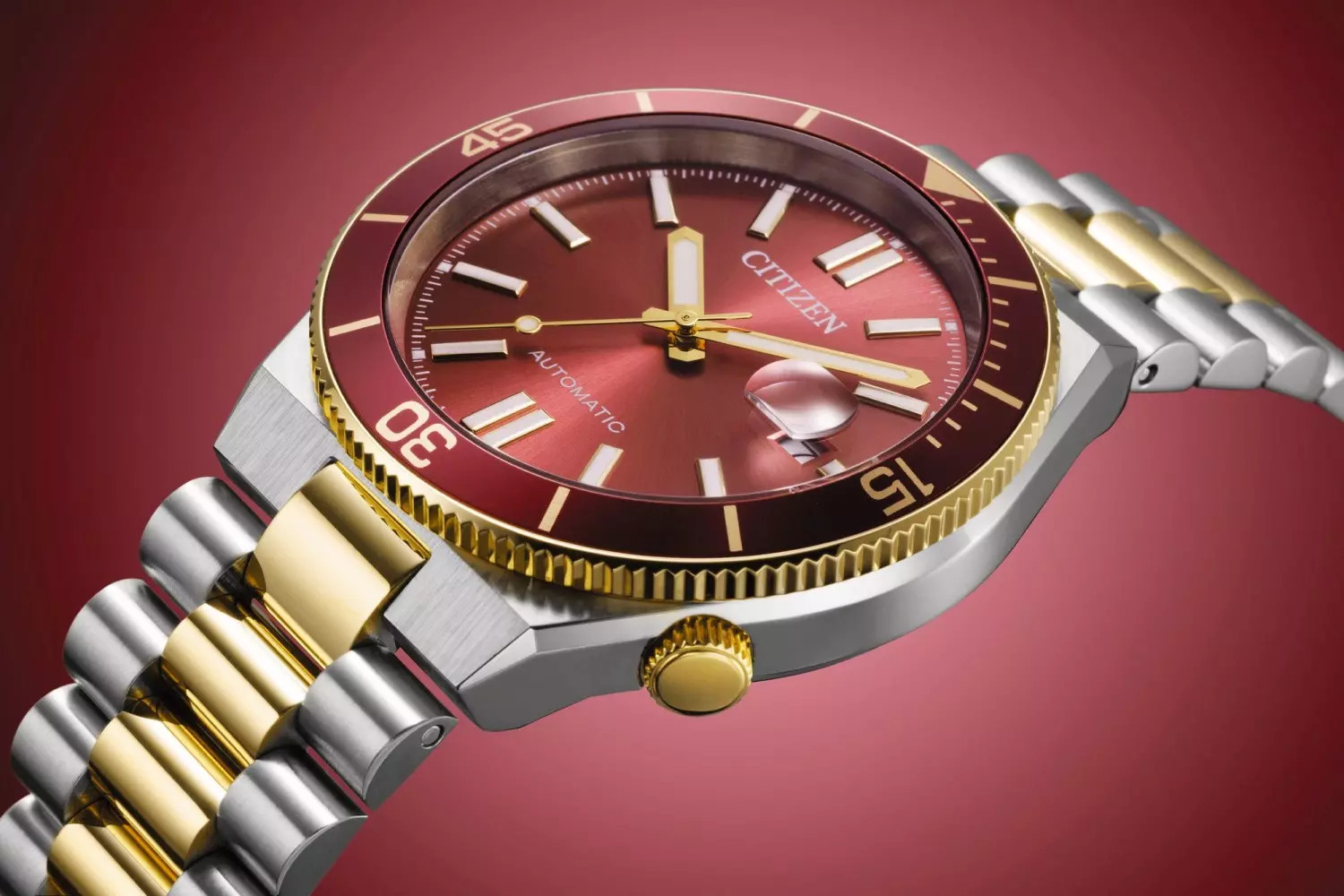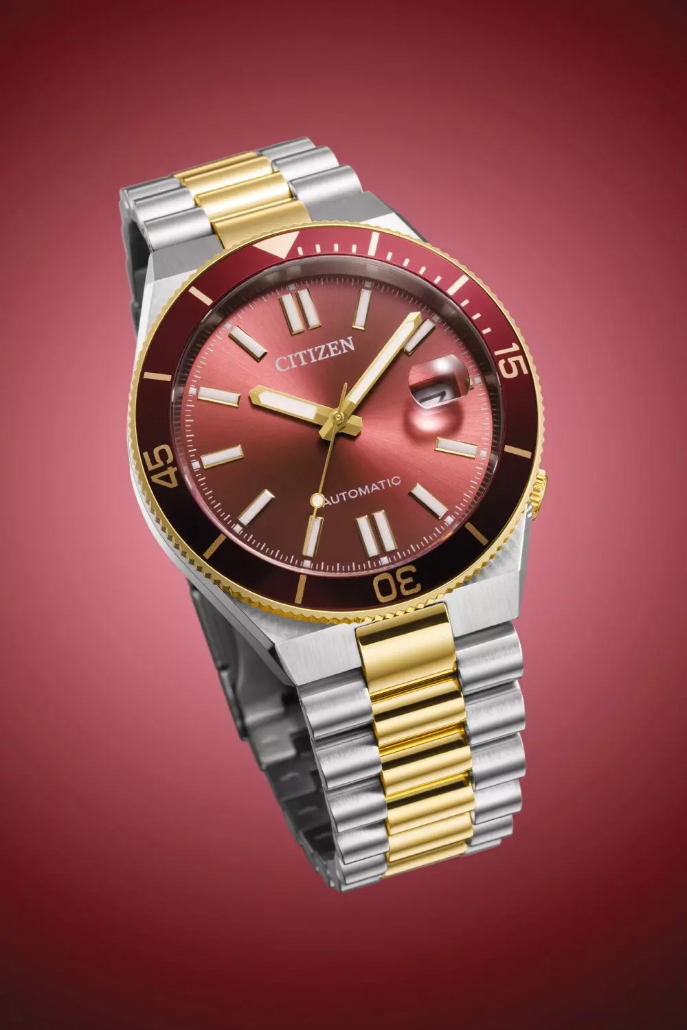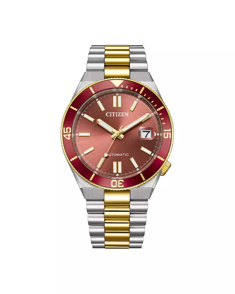 Citizen Tsuyosa NJ0234-58X er en stilren og ettertraktet automatisk herreklokke i rustfritt stål, som kombinerer sporty design med elegant finish. Klokken har en rød urskive med indeksmarkeringer, en matchende rød roterbar bezel og en solid lenke i tofarget rustfritt stål, noe som gir modellen et karakteristisk uttrykk.